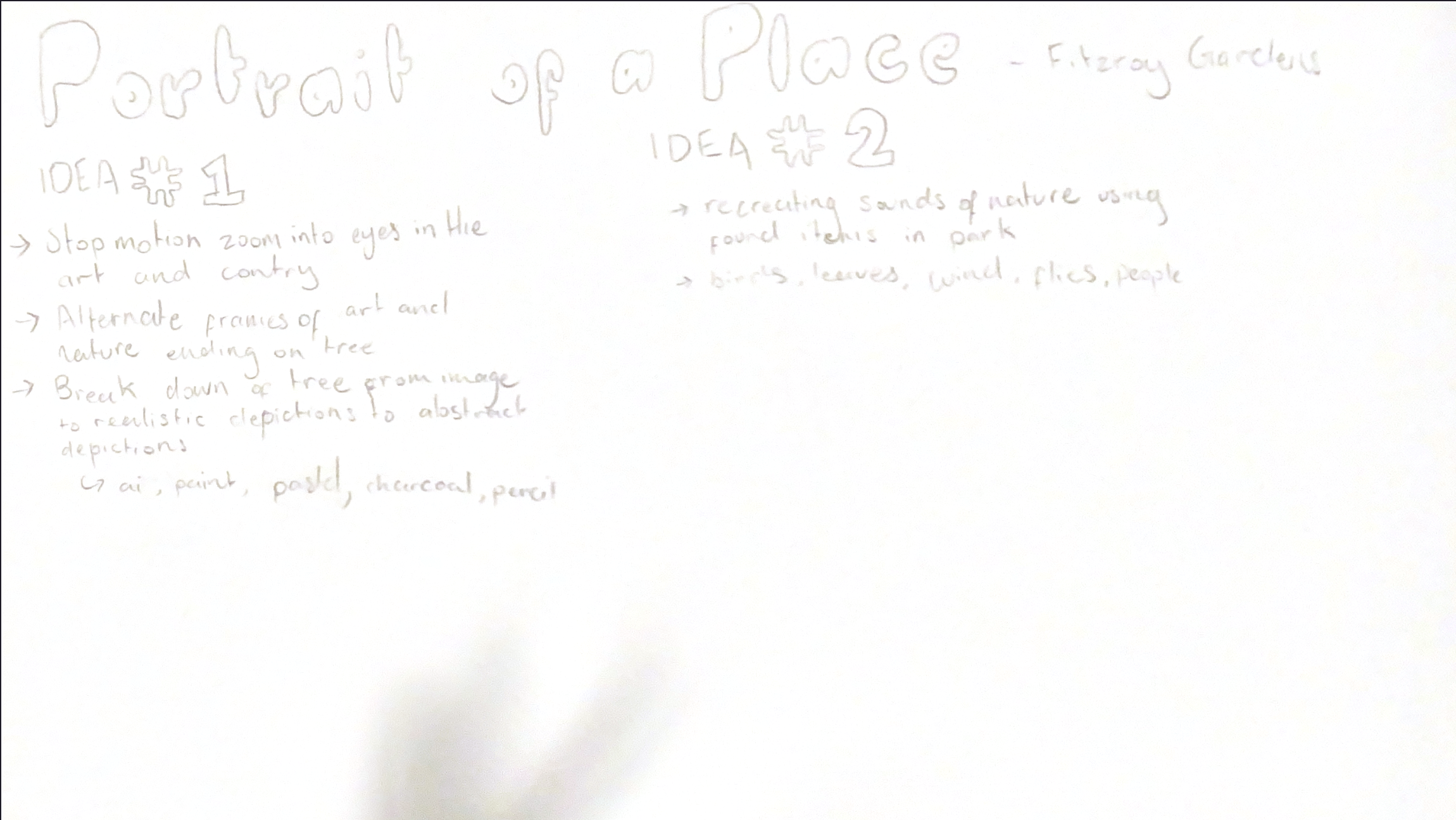 This task asked for a portrait of Fitzroy Gardens, this piece is inspired by an artwork displayed there. Its about the intersection of place and humans, starting with a girl talking about how in her country death is a slow journey back to where we came from. I breakdown components of a tree through different AI and hand painted interpretations to an origin (blank screen). There can be two interpretations viewers can look at the tree being insignificant as this journey leads to a blank. I am however trying to convey a journey leading to everything as it all dissolves together. To show this one random tree in Fitzroy gardens is connected to humans. I am hinting at the idea of being buried when we die referencing her belief of returning to somewhere in this case to the earth through death. She goes on to say through the eyes of the people we love this is very literally shown in the video zooming into her eyes to start this journey. However, she is not someone I love, the addition of clips including different people would be more fitting. It ends of with “we are briefly eternal” which relates back to the tree due to them having been around since the start of time. This idea of eternity and humans being a part of it is showing the true portrait of the place being everything as everything is connected.