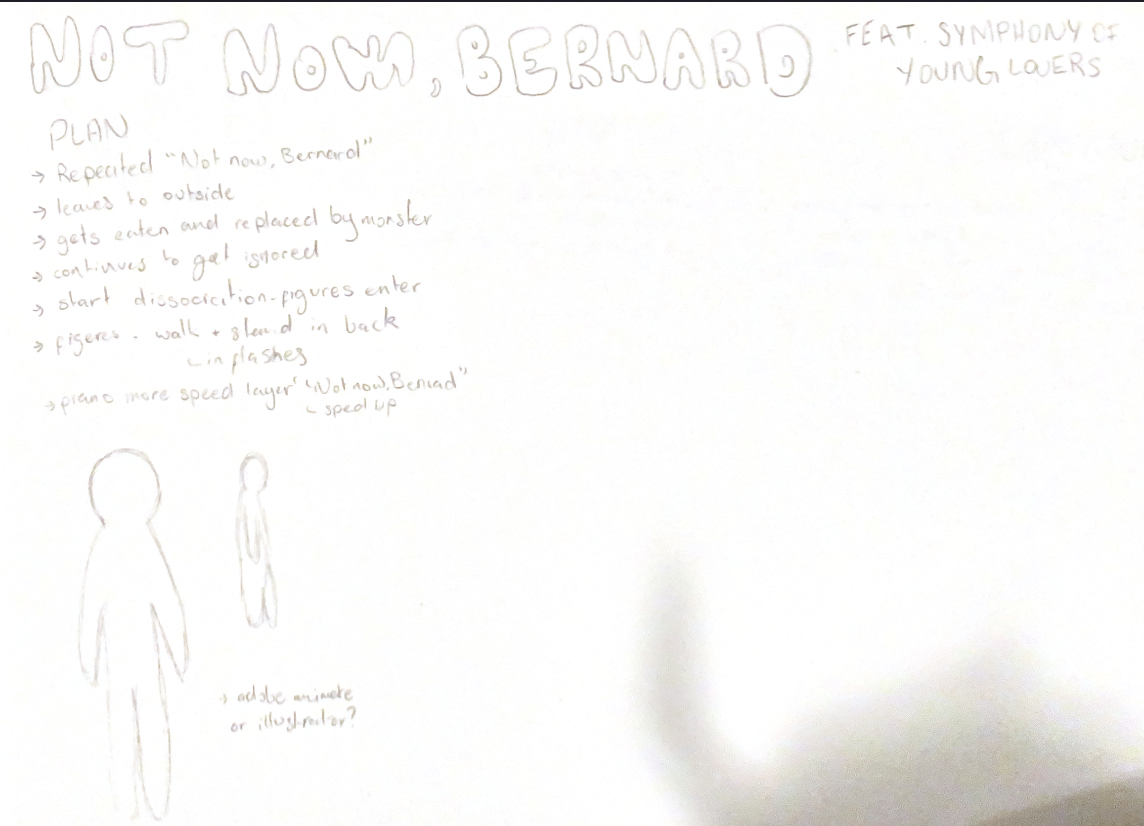 This task gave us a vinyl and VHS tape, giving an opportunity to explore its contents in any chosen way. For the concept of this piece I kept consistent with the storyline of Not Now, Bernard, the VHS tape I got. The cartoon follows a young Bernard who is consistently ignored by his parents until he gets eaten by a monster. The monster replaces Bernard and also gets ignored, hinting at Benard being the monster. My rendition furthers this concept by creating overlays using ultra key and roto brush to replicate Bernards dissociative techniques. The video starts with clips from the original story cut up to be shorter then escalates into a loop formed by clips from other stories sourced from the same VHS. The clips contains imagery of elephants and people crying as a parallel to this dissociative state in him becoming all these other figures, the elephants a subtle reference to being the elephant in the room and the crying people a reference to his internal feelings. The vinyl I got given was symphony of young lovers which I cut up and added through the end to further build intensity.