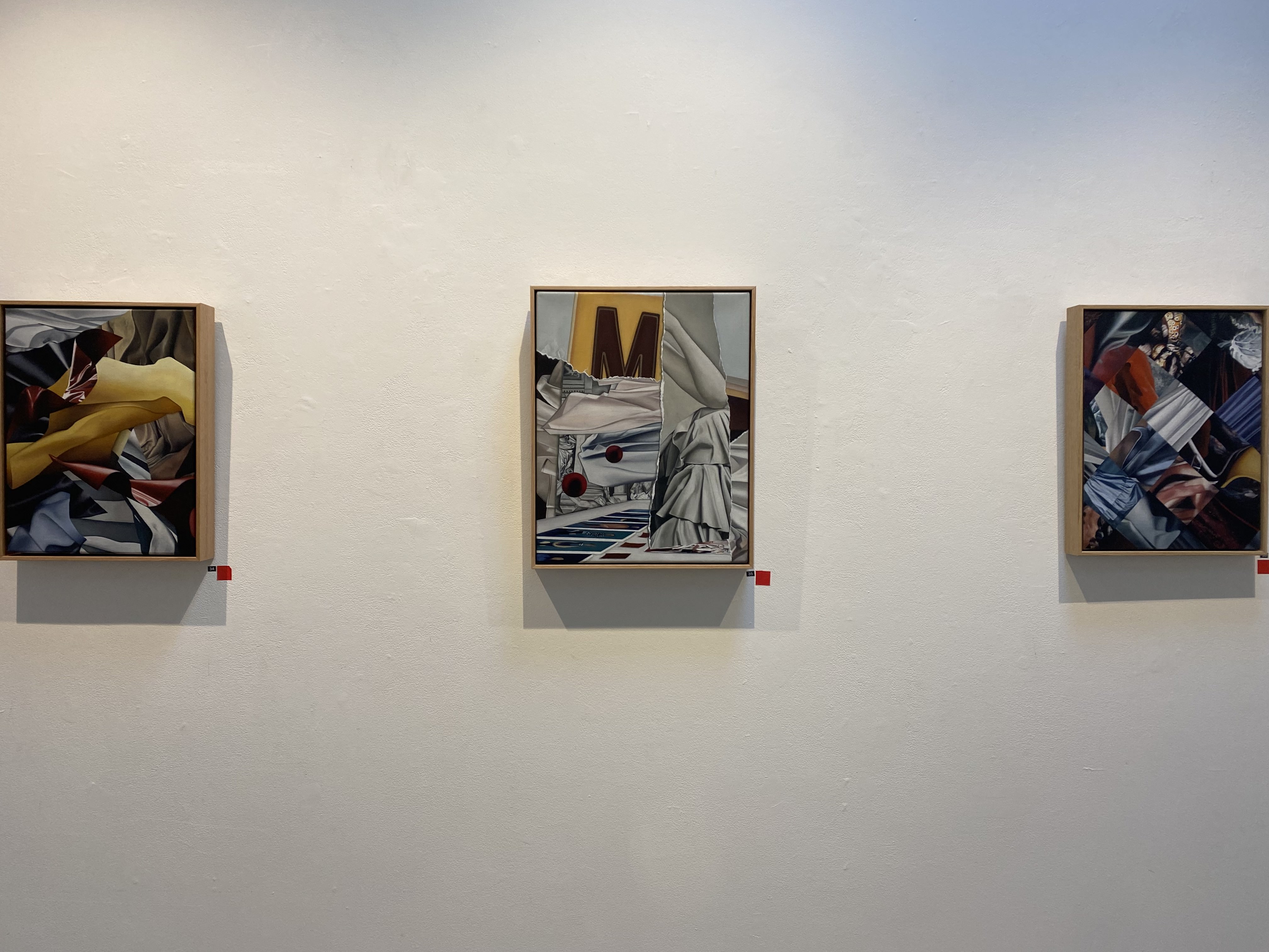 The Red Gallery is a small gallery placed next to a strip of shops piquing the interest of shoppers as they walk by. The gallery is split into 4 rooms, each room exhibiting one artist's work. The gallery is a commercial gallery and therefore turnover of the art exhibited there is quick. The catalogue is accessible for buyers to identify available art. A sign outside the door clearly marks the gallery and the bright red door draws attention to passersby. Lights are suspended on rails on the ceiling for easy mobility as exhibition change. The exhibition I saw had a theme of colour and shape. The artwork that interested me the most was a collection called ‘Driven to Abstraction’ by Rachel Tai who used oil paint to create highly rendered paintings with an abstract element of collage. She explores the space between realism and abstract distorting perception of well-known items. The fluidity of the fabrics contrasts with the harsh lines of the structured collage at points and at others blend into each other, however both create distinct shapes defined by the colours of the material. The concept of exploring the boundaries of reinterpretation at the intersection of real and not interests me. The work excited me as a viewer, the personalised interpretation of the ideas behind the work meant it delivered the concept and stayed visually pleasing. The composition of the works felt balanced, the colours complemented each other and created focal points through their depth and light. This work reflects my painting practice as I also explore the incorporation of abstract into realism, and the use of collage to do this inspires me. I enjoyed this gallery but recognise its commercial nature the works exhibited didn’t range as much as other galleries all of the works being 2 dimensional and none being digital. The curator explains “curation process is strict with over 400 artists applying every year, many applicants have to be turned down”. Therefore, the curation of the exhibition is to be profitable and meets the needs of both artist and gallery in its short show time which is to sell.